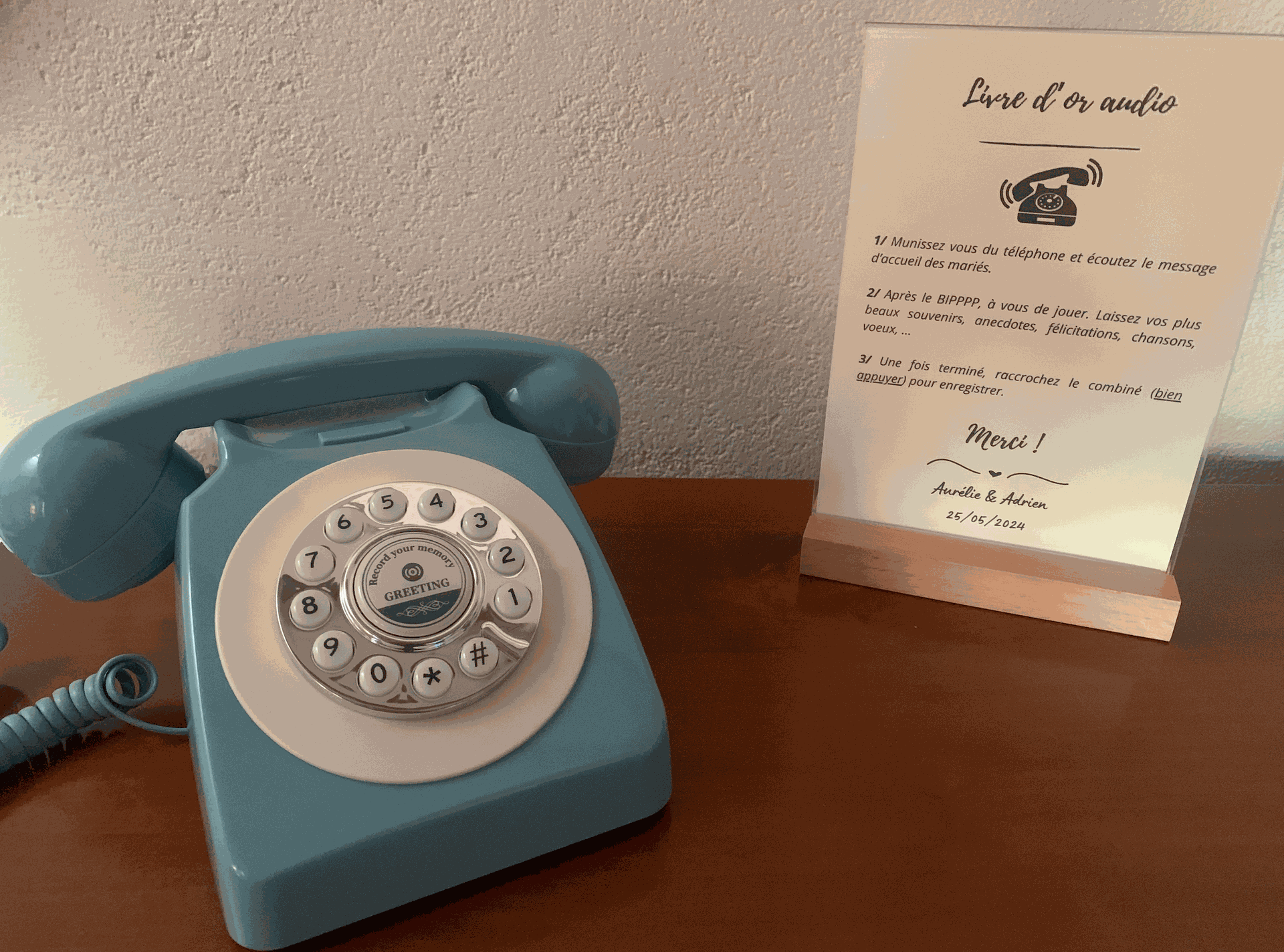 Pas de réglages compliqués : il suffit d’allumer le téléphone et de le poser sur une table. Vos invités décrochent, écoutent votre message, puis laissent le leur. Aussi facile qu’un coup de fil !
